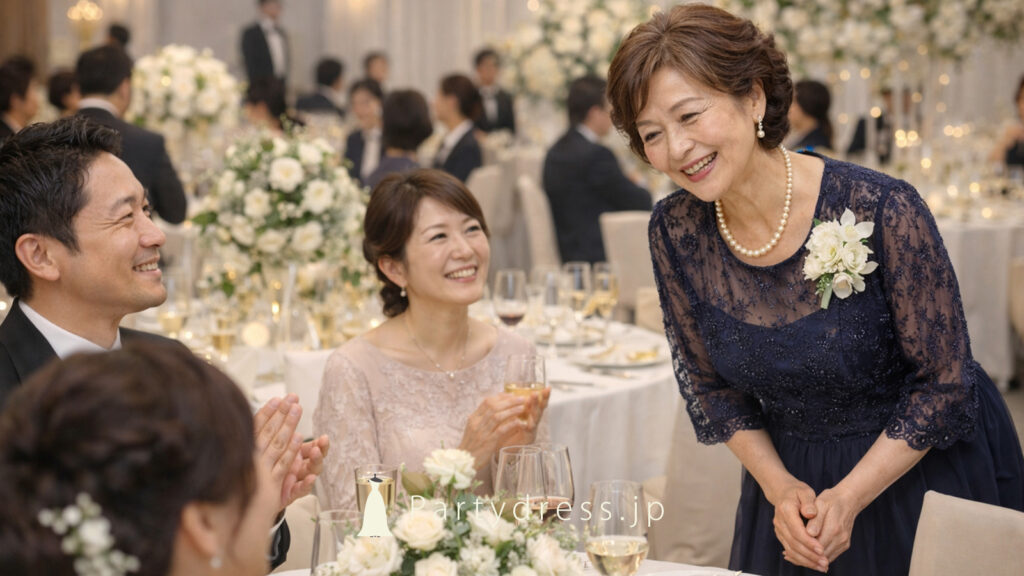黒留袖をずっと着てきたのですが、思い切って初めてドレスに挑戦しました。ネイビーのロングドレスは試着した瞬間に「これだ」と感じました。式当日は何人のゲストにも「素敵ですね」と声をかけていただき、娘にも喜んでもらえました。動きやすくて、式が終わるまで全く疲れを感じなかったのが一番の驚きです。